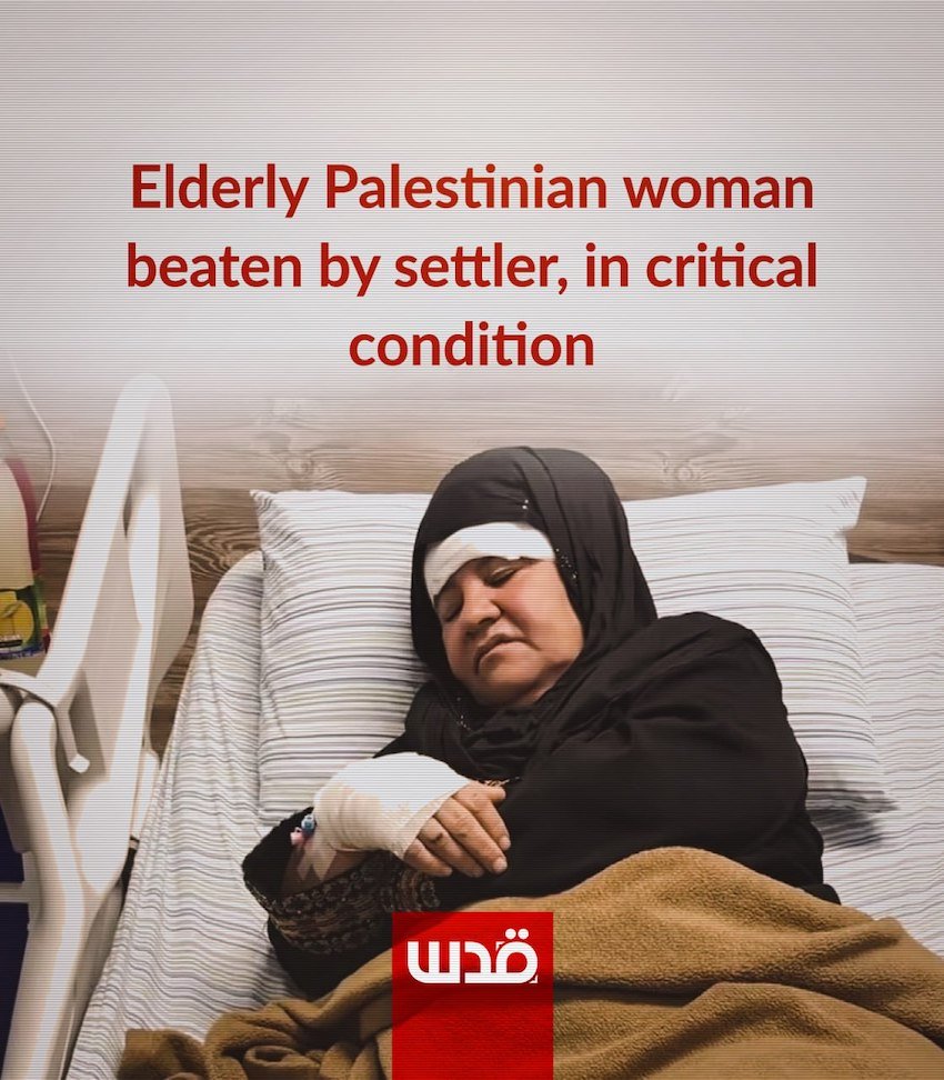 Afaf Abu Aliya, 55 ans, a été violemment agressée à la tête à coups de batte par un colon israélien dans la ville de Turmus‘ayya, au nord de Ramallah, en Cisjordanie occupée. Elle a été grièvement blessée. Cette attaque a été perpétrée par des gangs israéliens, sous la protection des forces israéliennes, contre des Palestiniens pendant la saison de la récolte des olives. Elle se trouve actuellement dans un état critique