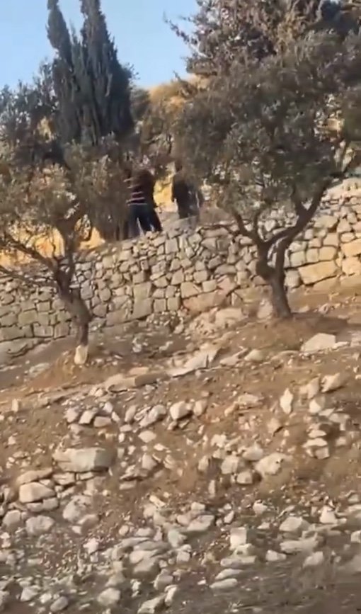 Des colons israéliens ont expulsé de force des agriculteurs palestiniens de leurs terres alors qu’ils récoltent leurs olives au sud de la ville de Deir Ballut, au centre de la Cisjordanie occupée.