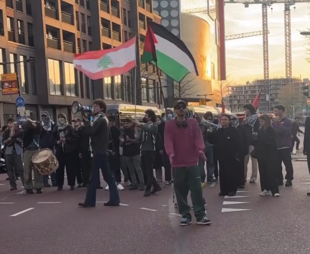 Mercredi soir, des manifestants bloquent une route à Utrecht, aux Pays-Bas, en signe de protestation contre les attaques continues de l’occupation israélienne sur Gaza et le Liban.