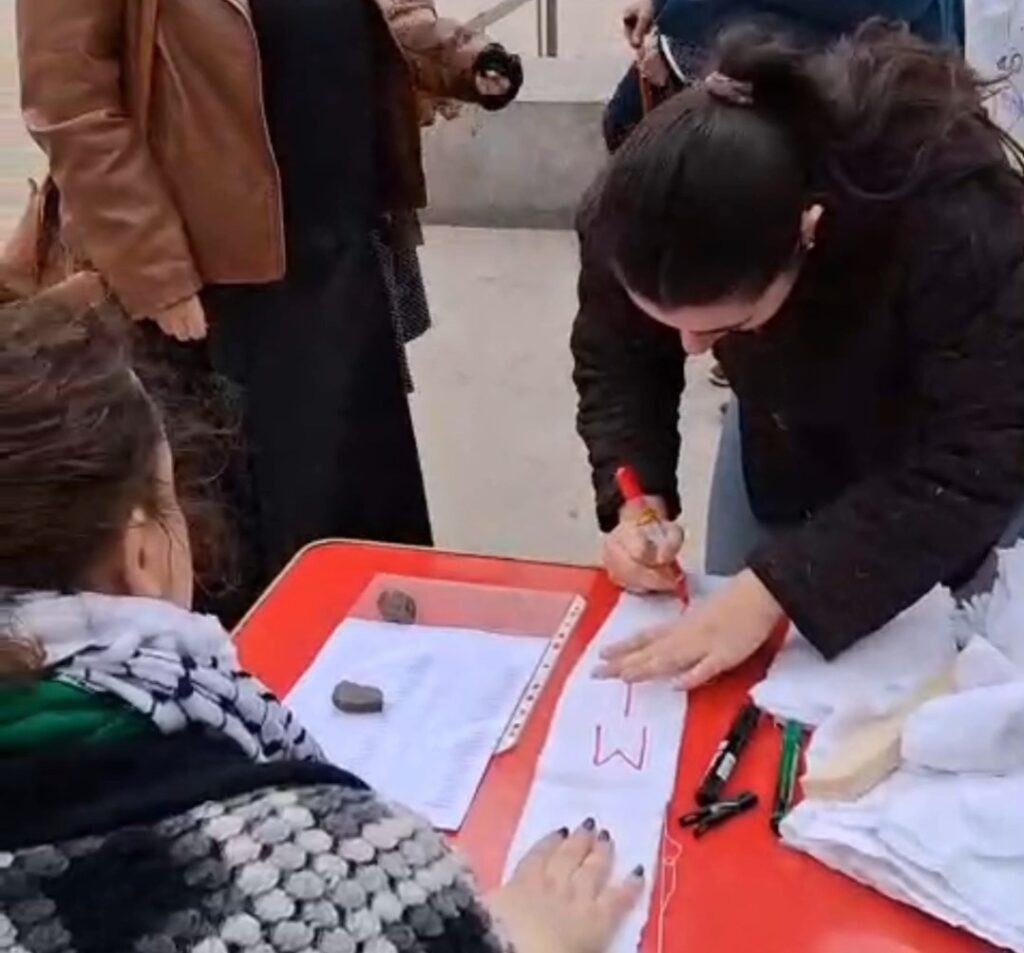 Excellent accueil des passants qui ont fait la queue pour écrire à leur tour deux noms sur des bandelettes de tissu au point qu’il n’y en a pas eu pour tout le monde. Ont aussi été associés à cet hommage les enfants iraniens et libanais tués dans les frappes israéliennes.