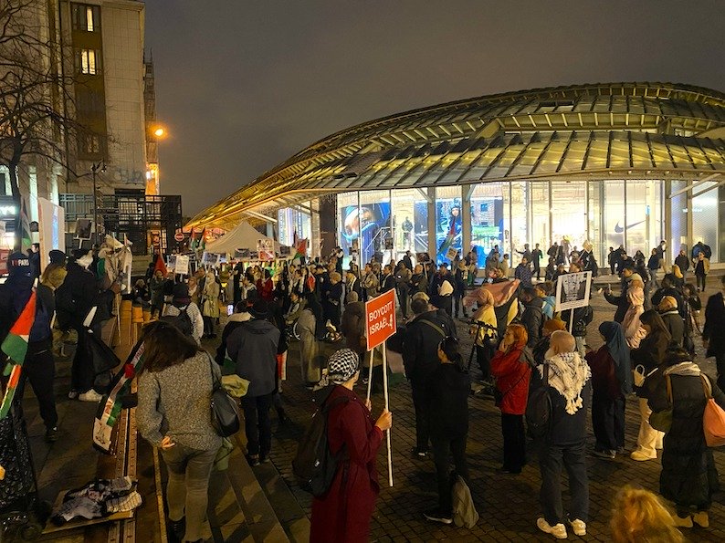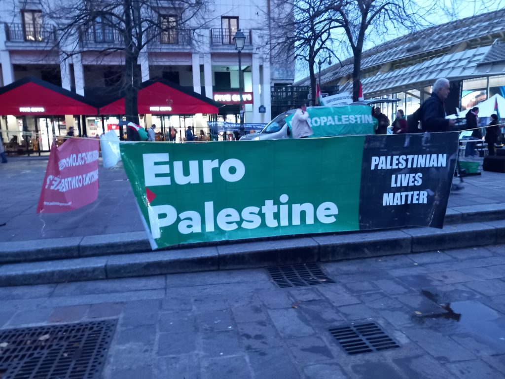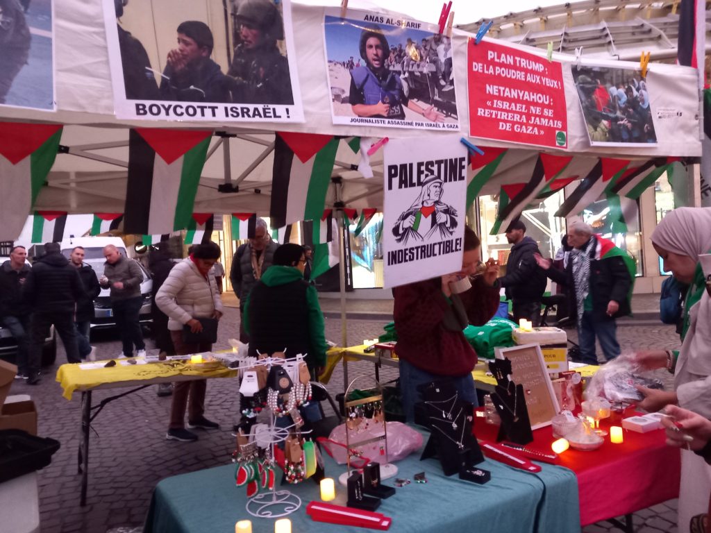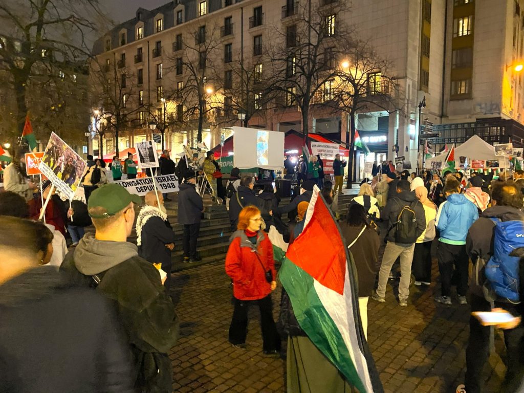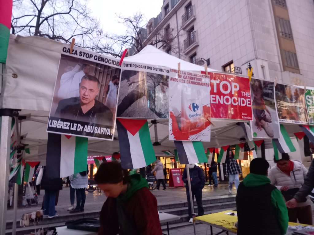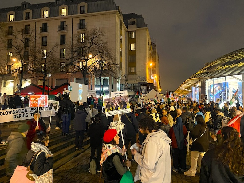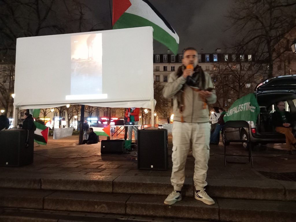 Nous avons interrompu notre projection plus tôt que prévu, afin d’aller soutenir, tout près de la Fontaine des Innocents, place du Châtelet, un rassemblement de soutien à Omar Soumis d’Urgence Palestine, qui était en garde à vue, accusé d’ »apologie de « terrorisme ».