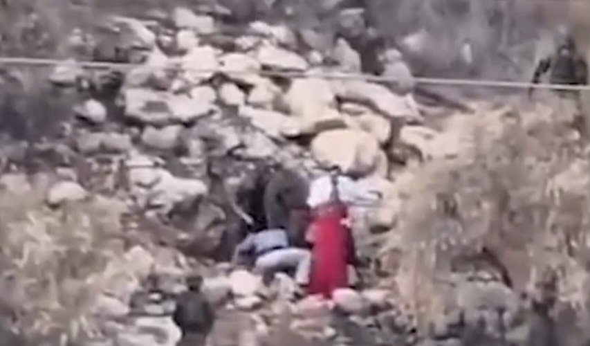 Un colon et des soldats d’occupation se relaient pour battre un agriculteur alors qu’il cueillait des olives dans la ville de Nahalin, à l’ouest de Bethléem.