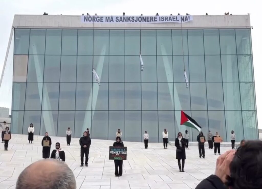 Des Norvégiens manifestent leur solidarité avec les prisonniers palestiniens détenus dans les prisons israéliennes devant l’Opéra de Norvège à Oslo.
