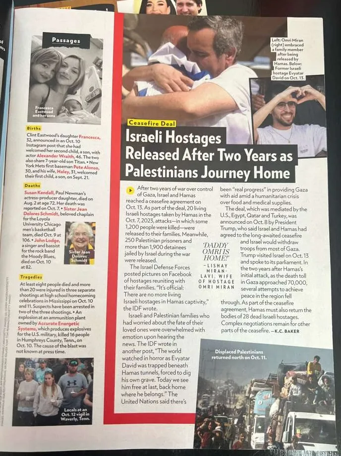 C’est exactement ce qui s’est passé dans une récente édition imprimée du magazine People, intitulée « Des otages israéliens libérés après deux ans de détention, tandis que des Palestiniens rentrent chez eux ». Cet article d’une demi-page tentait de couvrir le retour des otages israéliens encore en vie, mais ne parvenait guère à faire comprendre aux lecteurs les atrocités qu’ils avaient subies.