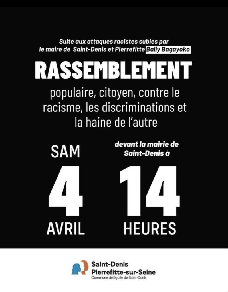 Nous irons manifester notre indignation et notre rejet du racisme ce samedi devant la mairie de Saint-Denis, suite aux insultes racistes proférées contre le nouveau maire, Bally Bagayoko.