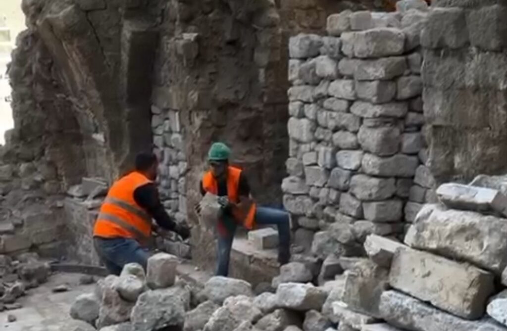 Des travailleurs palestiniens restaurent le célèbre bain d’Al-Sammara, vieux de plus de 900 ans, qui a été bombardé par des attaques israéliennes pendant le génocide à Gaza.