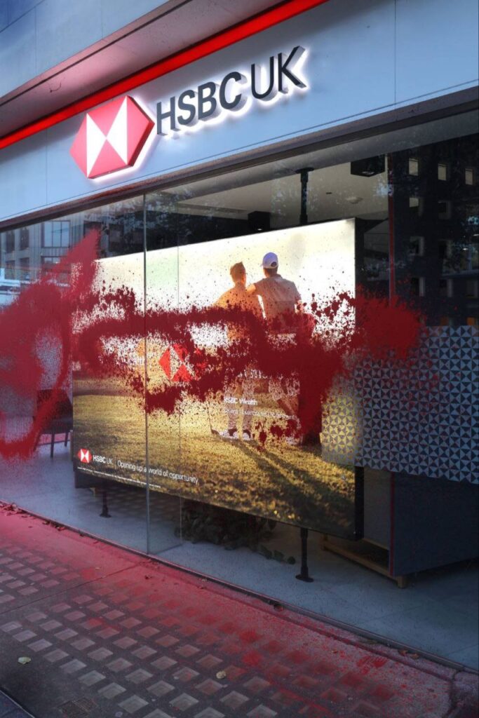 Dans la nuit de samedi à dimanche, des militants de l’association People Against Genocide (Personnes contre le génocide) ont ciblé cinq agences HSBC à Londres et onze autres au Royaume-Uni, en signe de solidarité avec la Palestine et les grévistes de la faim de Palestine Action.