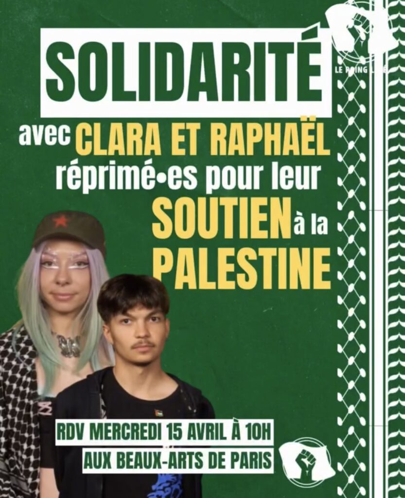 Dans la même ligne de répression estudiantine, deux étudiants des Beaux-Arts de Paris passeront en conseil de discipline la semaine prochaine pour leur soutien à la Palestine. Dans cette vidéo Clara et Raphaël dénoncent la politique de l’école, et appellent à leur soutien.