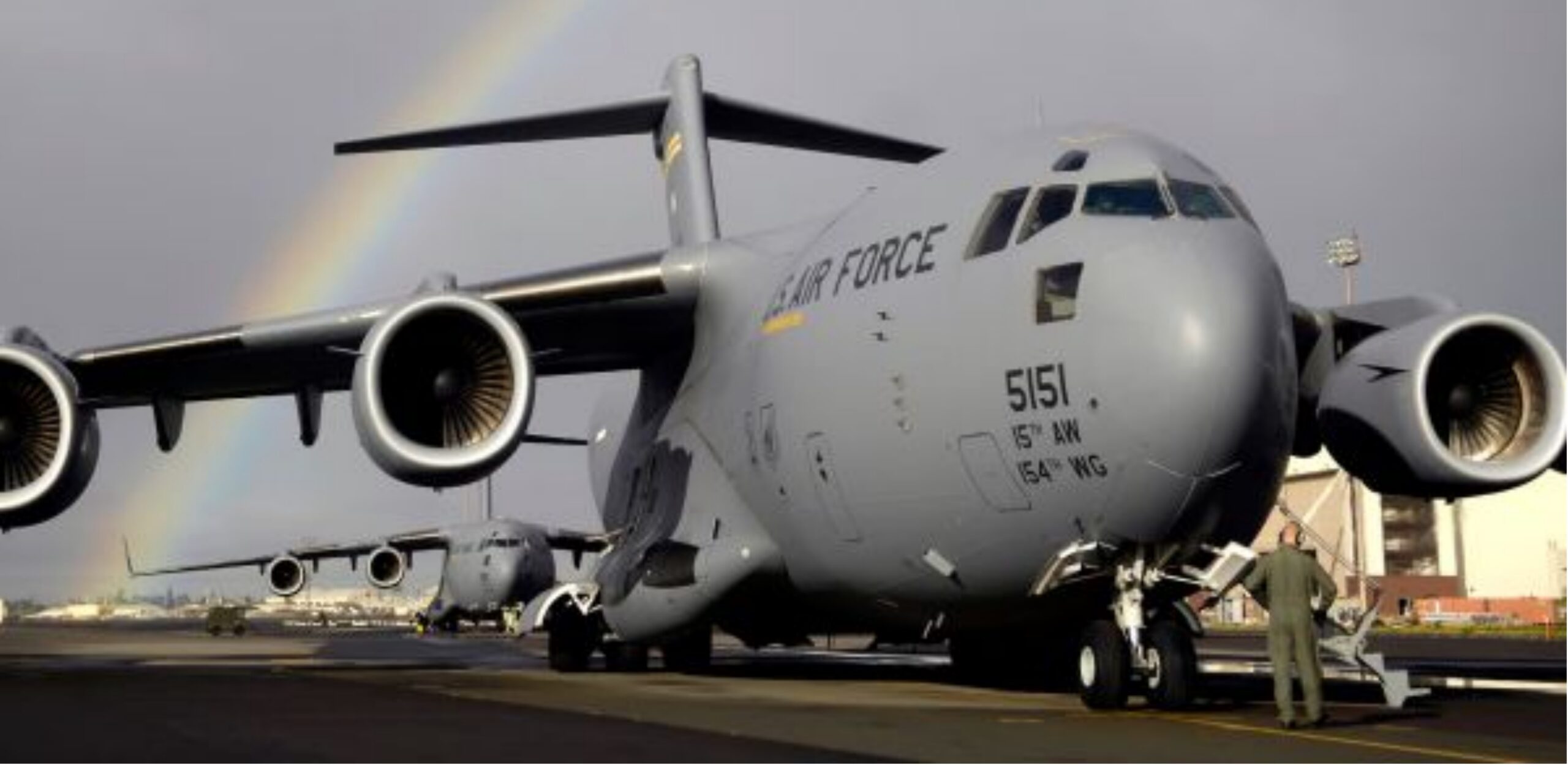 Lieu et origine : Il est souligné que quatre avions C-17 de l’US Air Force se dirigent d’urgence vers l’île de Diego Garcia, dont trois décollent de la base aérienne de Ramstein en Allemagne [00:03].