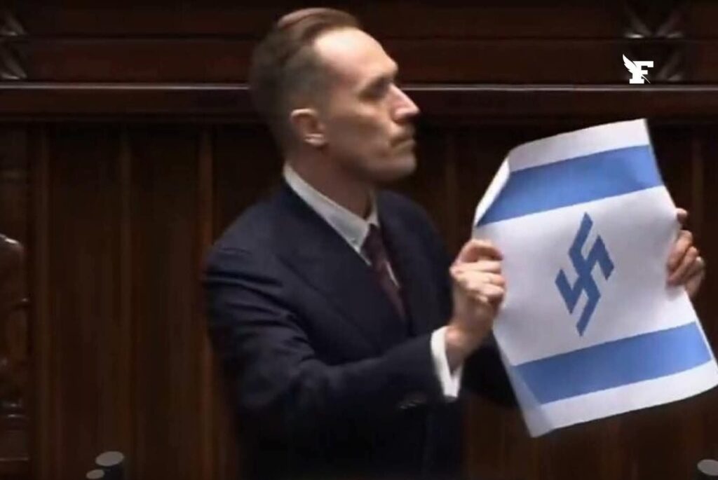 Un député du parti d’opposition d’extrême droite polonaise a accusé l’État d’Israël de perpétrer «un génocide» au Moyen Orient, et brandi un drapeau israélien frappé d’une croix gammée nazie, ce mardi lors d’une réunion du Parlement polonais.