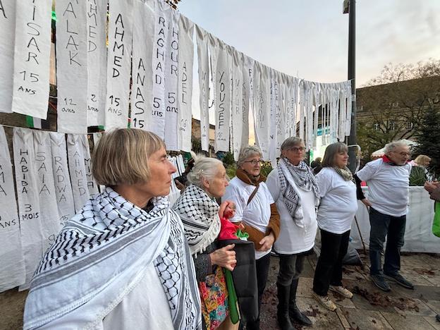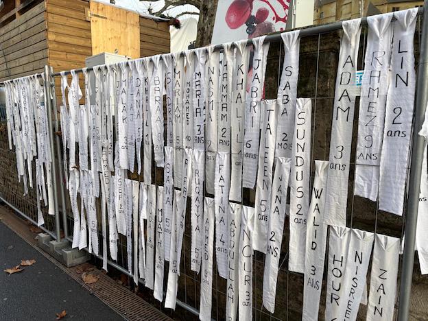 A la grande surprise du public, le marché de Noël à Sarlat a vu apparaître jeudi des « décorations » inhabituelles : des centaines de bandes en tissu portant les prénoms et âges d’enfants assassinés par Israël à Gaza.