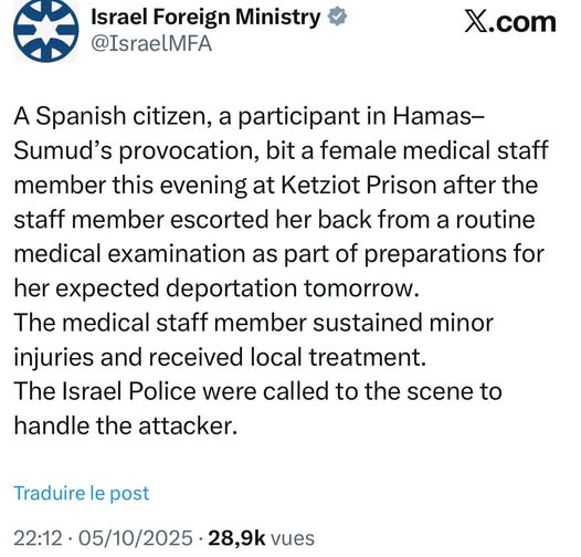 « Une citoyenne espagnole, participante à la provocation du Hamas-Sumud, a mordu une soignante ce soir à la prison de Ketziot, après que celle-ci l’ait raccompagnée après un examen médical de routine en prévision de son expulsion prévue demain.
