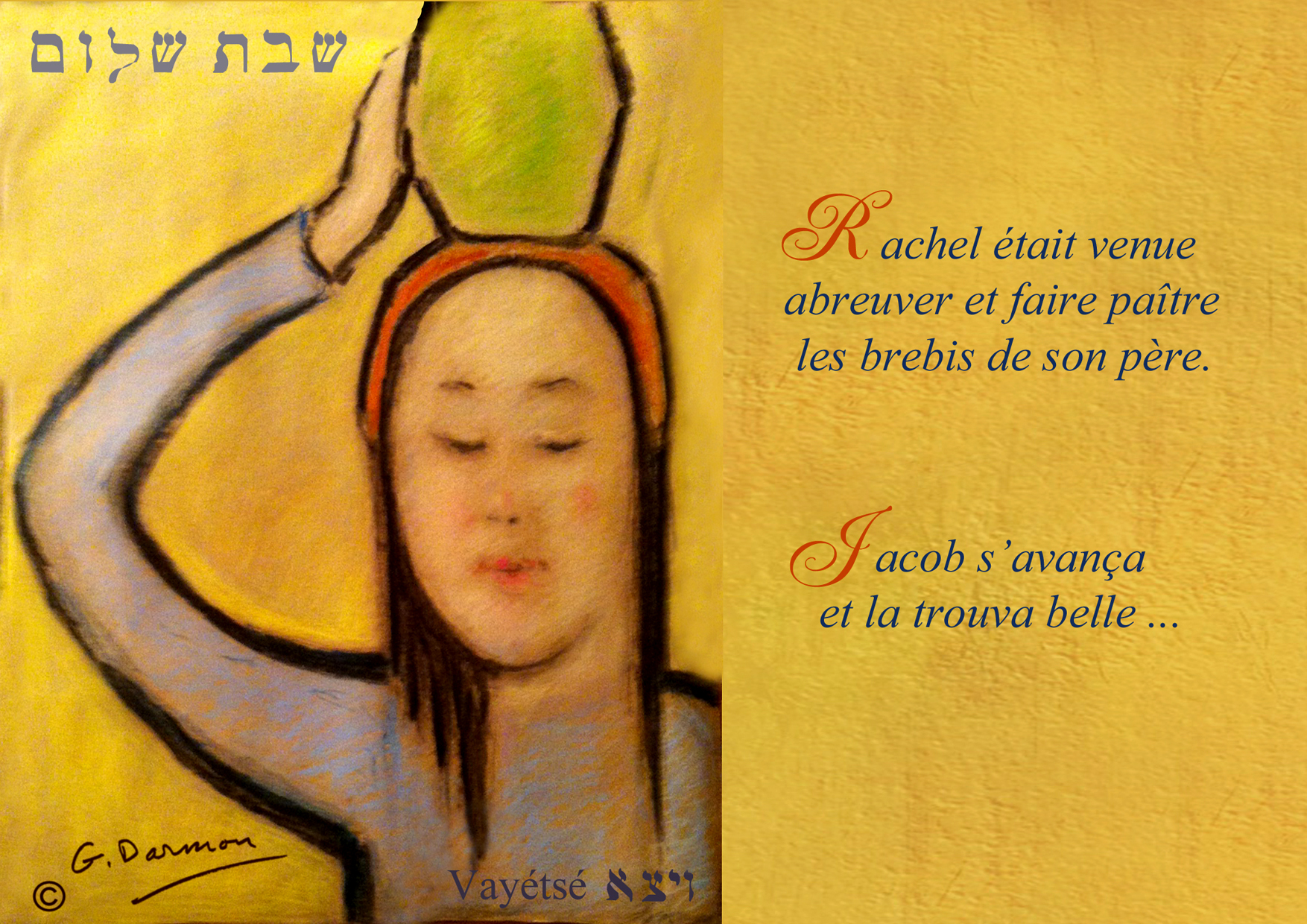 « Il fit un rêve (h’alom) et voici qu’une échelle (soulam) était dressée (moutsav) vers la terre et son sommet conduisant vers les cieux (hachamaïma) ; et voici que des Envoyés de Dieu (malakhim) y montaient et en descendaient (bo). Et voici que l’Eternel (Tétragramme) se tenait au dessus de lui (nitsav) et lui dit: «Je suis l’Eternel, Dieu d’Abraham ton père, et Dieu d’Isaac; la terre sur laquelle tu es couché c’est à toi que je la donnerai ainsi qu’à ta postérité» (Gn, 28, 12, 13).