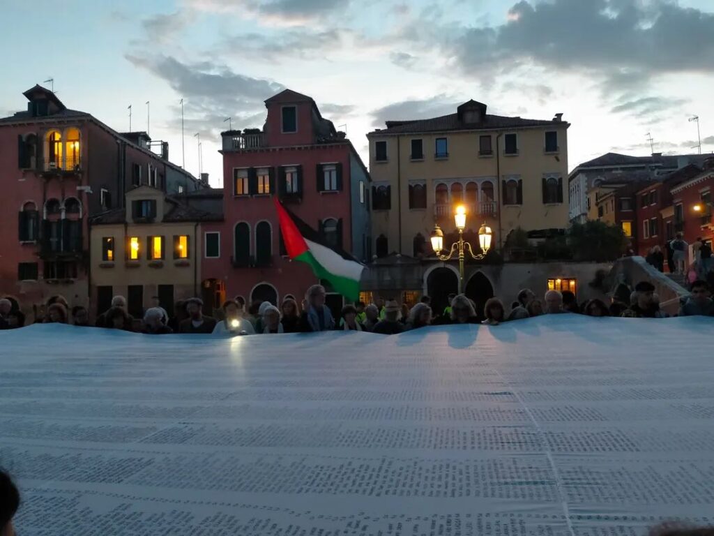 A Venise, Campo Santi Giovanni e Paolo , des militants ont déroulé un immense drap blanc de 7,5 mètres de large et 25 mètres de long, portant les noms de 18 457 enfants palestiniens, garçons et filles, âgés de 0 à 17 ans, tués à Gaza par les forces israéliennes depuis le 7 octobre 2023. Parmi eux, de nombreux nouveau-nés, déjà inscrits au Hamas, sans doute ?