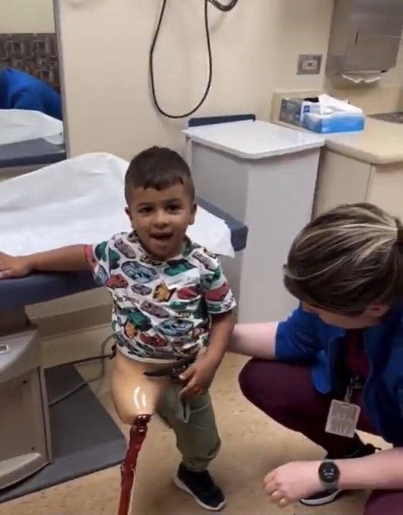 Après avoir été évacué de Gaza vers les États-Unis pour y être soigné, Adam Abufoujo, un orphelin palestinien de quatre ans, amputé après avoir été bombardé par Israël, a fait ses premiers pas avec une prothèse de jambe à Chicago.