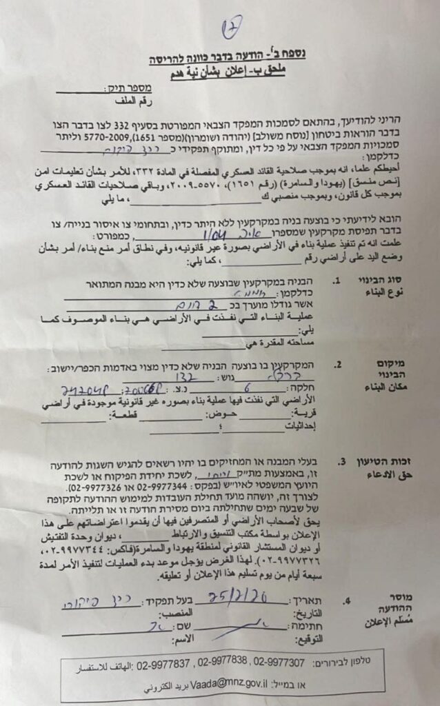 L’occupation israélienne a émis des avis de démolition pour plusieurs serres agricoles palestiniennes dans le village de Bardala, dans la vallée du Jourdain.